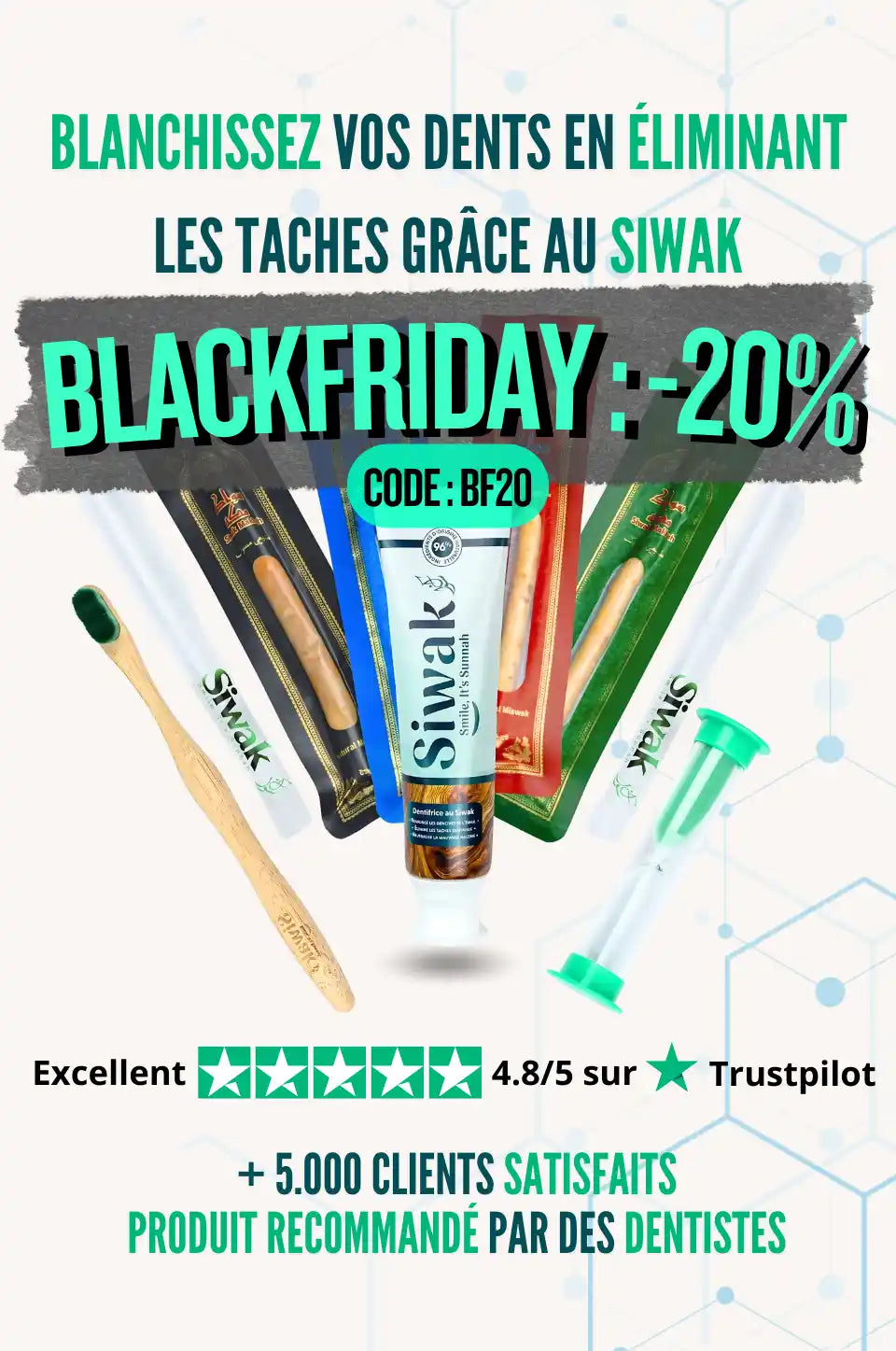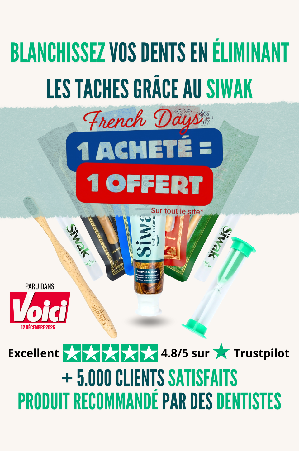 Depuis des siècles, le siwak est utilisé pour ses propriétés antibactériennes et blanchissantes. Aujourd’hui, la science le confirme : il réduit la plaque, combat les bactéries et favorise une haleine fraîche. Chez SiwakSmile, nous avons allié cette sagesse ancestrale aux avancées scientifiques. Enrichi en hydroxyapatite et PAP+, notre dentifrice reminéralise l’émail et éclaircit les dents sans agresser.